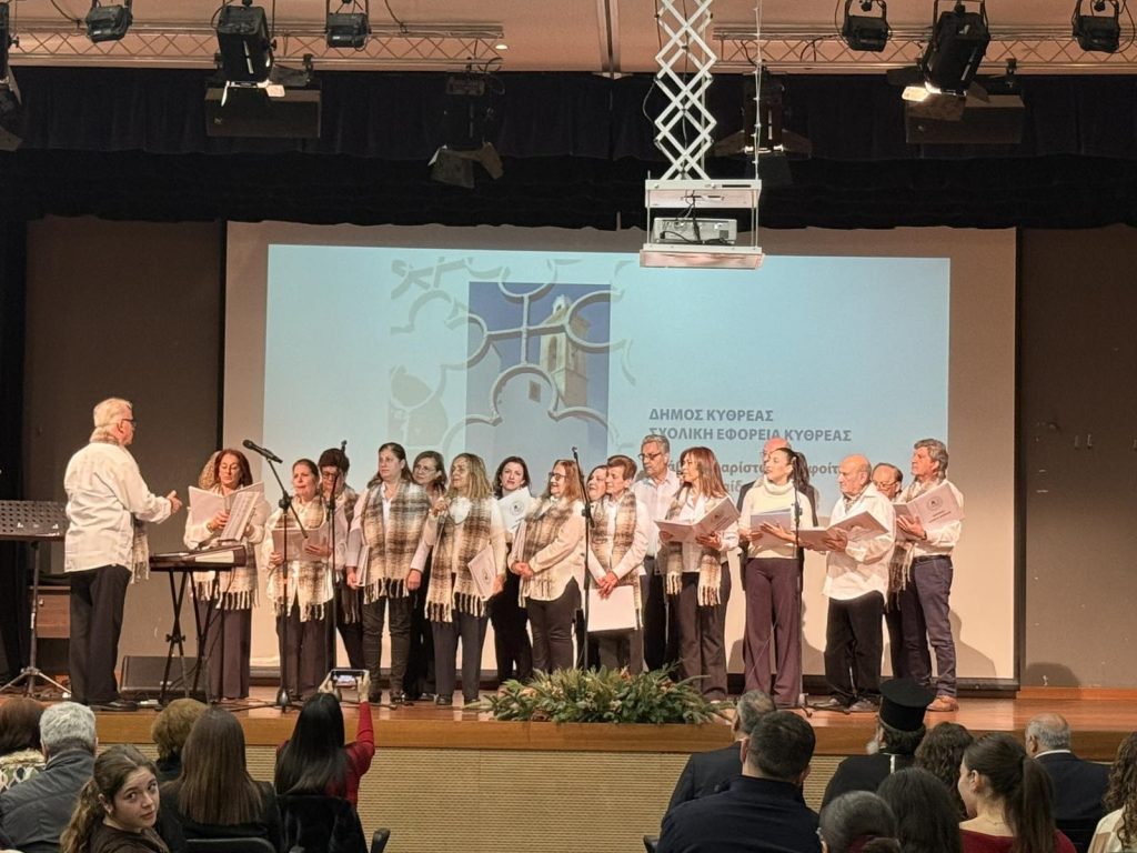 Η εκδήλωση ολοκληρώθηκε με εορταστικό πρόγραμμα από τη Δημοτική Χορωδία Κυθρέας υπό τη διεύθυνση του Δημήτρη Κωνσταντίνου, με τη συμμετοχή της Κυθρεώτισσας σοπράνο Πηνελόπης Καραολιά Προκοπίου.
