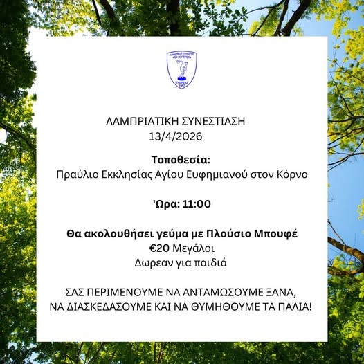 Το Σωματείο “ΟΙ ΧΥΤΡΟΙ” Κυθρέας διοργανώνει και φέτος την καθιερωμένη λαμπριάτικη συνεστίαση Κυθρεωτών τη Δευτέρα της Λαμπρής 13/4/2026.