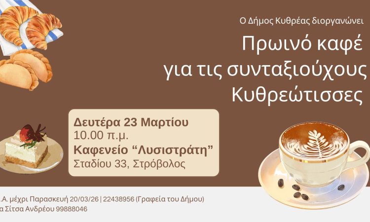 Η άνοιξη είναι εδώ και ο Δήμος μας προσκαλεί τις συνταξιούχους Κυθρεώτισσες σε πρωινό συναπάντημα στο καφενείο γυναικών “Λυσιστράτη” στον Στρόβολο, τη Δευτέρα 23 Μαρτίου 2026 στις 10.00 π.μ.